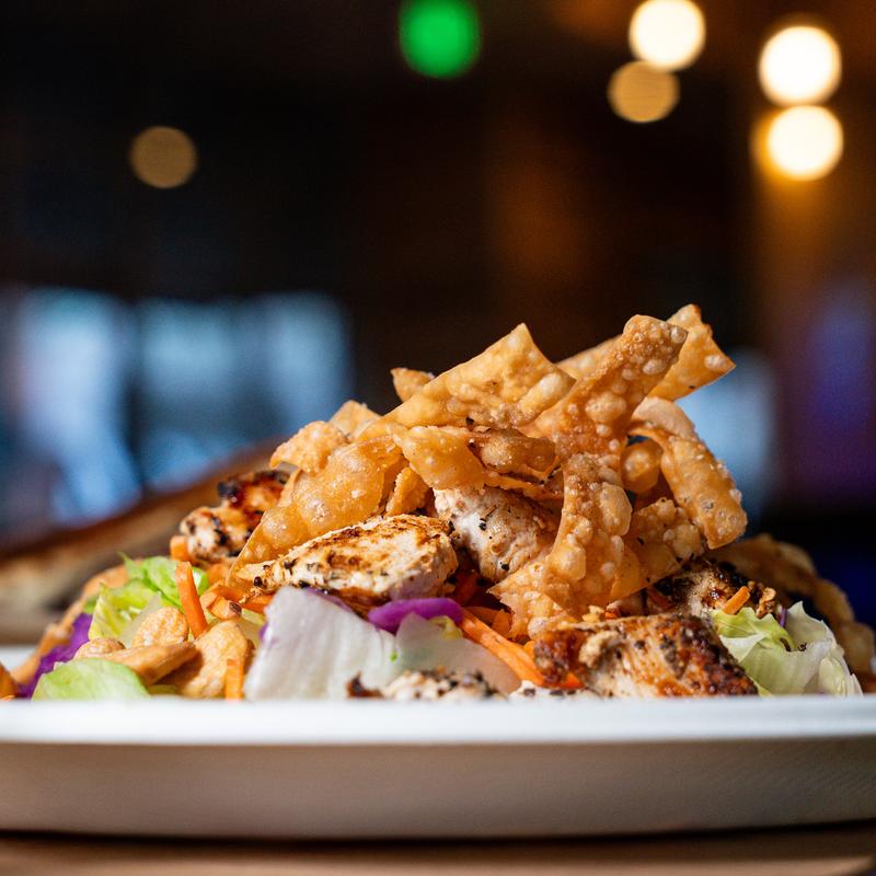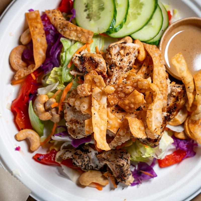 Grilled Chicken/ Cabbage/ Iceberg/ Carrots/ Roasted Red Peppers/ Cucumbers/ Cashew/ Wontons/ Sesame Ginger Vinaigrette